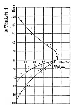1-上鄰近層排放曲線,2-近水平和緩傾斜煤層下鄰近層排放曲線,