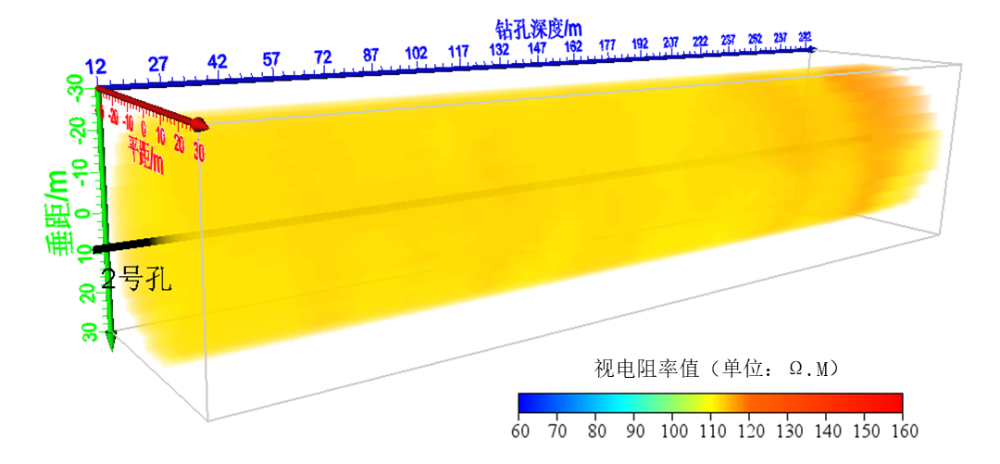 針對這種情況,駱駝山煤礦與中煤科工集團西安研究院、地球物理勘探技術與裝備研發(fā)中心開展合作,成立電法勘探技術研究所烏海項目部,開展鉆孔瞬變電磁水害超前探測方法的研究應用。通過鉆機推送,將收發(fā)一體探頭送入鉆孔,經過接收鉆孔周圍低阻體的二次感應場三分量信號,采用精細反演算法和無監(jiān)督機器學習算法完成電阻率智能立體成像,實現孔旁低阻富水異常體的精準定位,最終形成以鉆孔為中心,徑向30米半徑圓柱范圍內富水異常區(qū)的三維超前探測成果,成功將此探測新技術應用于該礦井下掘進巷道水害超前探測。該技術不僅彌補了鉆探“一孔之見”的不足,達到“一孔多用”效果,也為后續(xù)在定向長鉆孔中開展鉆孔瞬變電磁、鉆孔地質雷達和自然伽馬等孔中物探聯合探測新技術推廣提供了前期應用基礎,為礦井掘進巷道地質透明化提供了可靠地質保障。
