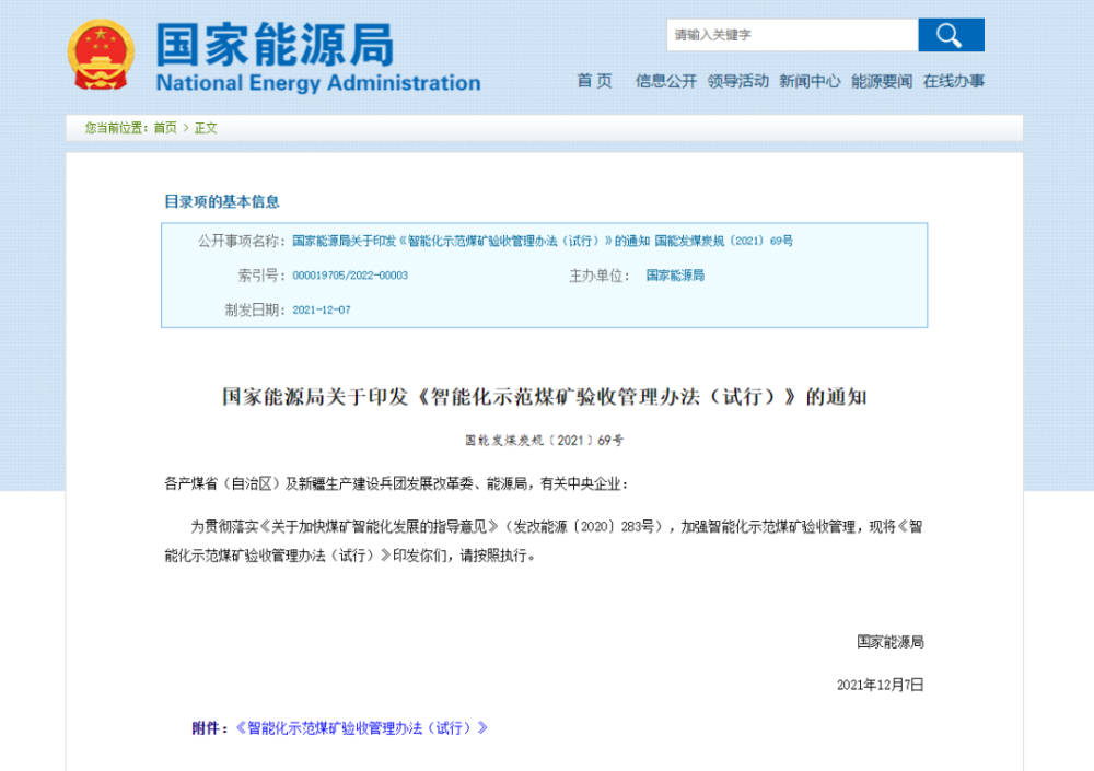 國家能源局印發(fā)《智能化示范煤礦驗(yàn)收管理辦法(試行)》