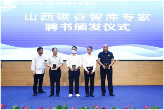 智庫(kù)、學(xué)術(shù)、科普是科協(xié)系統(tǒng)三大工作職責(zé),山西省科協(xié)作為新型智庫(kù)建設(shè)單位與國(guó)家級(jí)科技思想庫(kù)建設(shè)試點(diǎn)單位,也是省委確定的省校合作智庫(kù)示范基地,為充分發(fā)揮科技人才優(yōu)勢(shì),助力“雙碳”行動(dòng),特設(shè)立山西碳谷科技創(chuàng)新智庫(kù)與山西碳谷院士創(chuàng)新中心,為院士專家開(kāi)展創(chuàng)新創(chuàng)業(yè)搭建平臺(tái),提供服務(wù)。開(kāi)幕式上,金智新、丁紀(jì)崗共同為山西碳谷科技創(chuàng)新智庫(kù)、山西碳谷院士創(chuàng)新中心揭牌。晉中市委常委統(tǒng)戰(zhàn)部部長(zhǎng)貢琦、中共山西省委宣傳部理論處處長(zhǎng)劉曉哲、山西省科協(xié)宣調(diào)部部長(zhǎng)張學(xué)東共同為省人大常委、中國(guó)科學(xué)院山西煤炭化學(xué)研究所煤轉(zhuǎn)化國(guó)家重點(diǎn)實(shí)驗(yàn)室研究員韓怡卓,山西省碳達(dá)峰碳中和產(chǎn)業(yè)創(chuàng)新聯(lián)合體秘書(shū)長(zhǎng)、山西省氣象學(xué)會(huì)副理事長(zhǎng)兼秘書(shū)長(zhǎng)李培仁,山西銀行副行長(zhǎng)秦凱,尚風(fēng)科技股份有限公司董事長(zhǎng)孟新利,浦發(fā)銀行晉中分行行長(zhǎng)陳明棟等11位山西碳谷科技創(chuàng)新智庫(kù)首批專家頒發(fā)聘書(shū)。