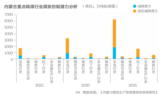 近年來,鋼鐵、煤化工、火電和有色金屬等行業(yè)一直在內蒙古的工業(yè)結構中占據(jù)半壁江山,這些產業(yè)的發(fā)展是內蒙古區(qū)域煤炭消費量增加的主要原因,其中,煤電所消費的煤炭量常年穩(wěn)定在當?shù)孛禾肯M總量的50%~60%。同時,這些高耗能產業(yè)也兼具高碳排放的特征。因此,為重點耗煤行業(yè)設定清晰科學的綠色轉型路徑,是推動內蒙古煤炭行業(yè)整體綠色轉型的重要保障。遏制“兩高”項目盲目上馬,是內蒙古實施減煤降碳的第一步。