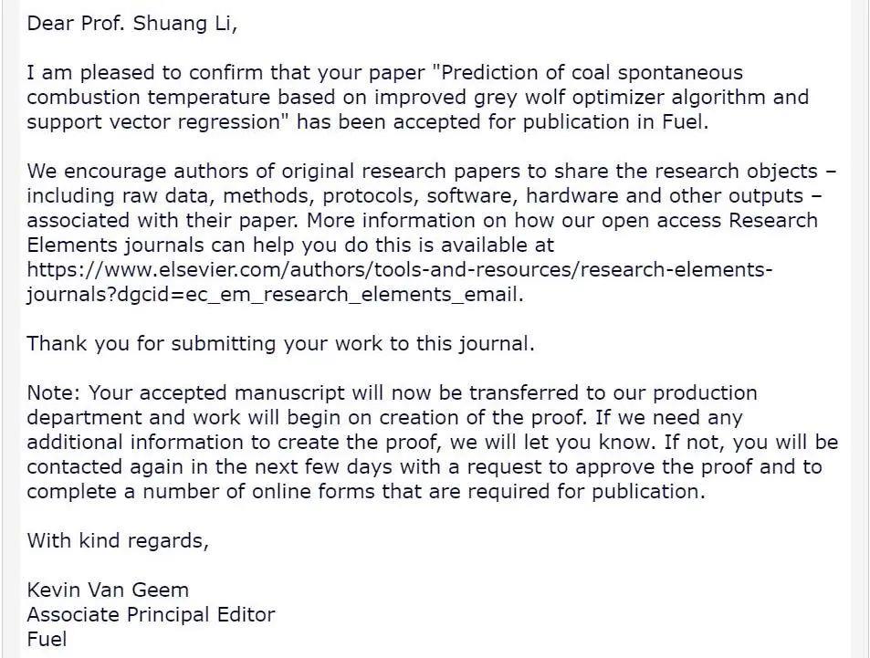 中國(guó)礦業(yè)大學(xué)安全科學(xué)與應(yīng)急管理研究院院長(zhǎng)李爽教授團(tuán)隊(duì)的學(xué)術(shù)論文 Prediction of coal spontaneous combustion temperature based on improved grey wolf optimizer algorithm and support vector regression 被能源領(lǐng)域頂級(jí)期刊Fuel錄用。Fuel由Elsevier出版,主要發(fā)表能源和燃料方面的原創(chuàng)性研究成果,是國(guó)際公認(rèn)的能源領(lǐng)域頂級(jí)期刊,最新影響因子8.035,中科院最新SCI分區(qū)顯示該期刊為工程技術(shù)類1區(qū)TOP期刊。