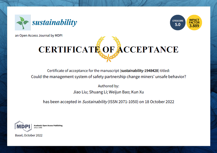 該學(xué)術(shù)論文《Could the Management System of Safety Partnership Change Miners’ Unsafe Behavior?》 已被Sustainability錄用,最新影響因子4.089。Sustainability是一本關(guān)于人類環(huán)境、文化、經(jīng)濟和社會可持續(xù)性的國際跨學(xué)科學(xué)術(shù)期刊,該刊已被國際權(quán)威數(shù)據(jù)庫SCIE、SSCI收錄。