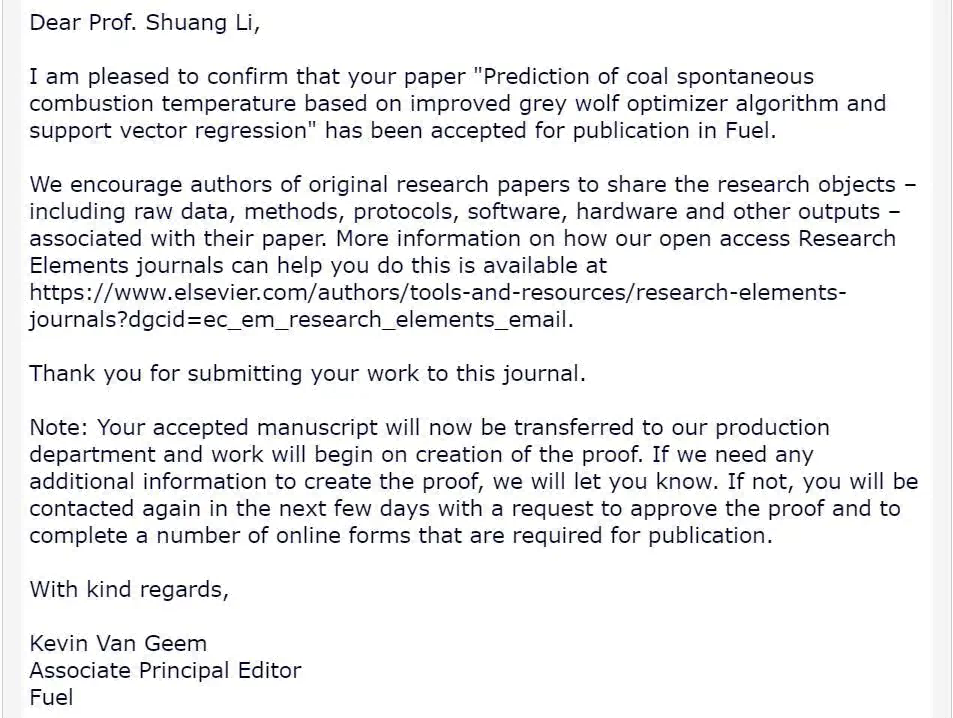 該研究《Prediction of coal spontaneous combustion temperature based on improved grey wolf optimizer algorithm and support vector regression 》被能源領(lǐng)域頂級期刊Fuel錄用。Fuel是國際公認的能源領(lǐng)域頂級期刊,主要發(fā)表能源和燃料方面的原創(chuàng)性研究成果,最新影響因子8.035,中科院最新SCI分區(qū)顯示該期刊為工程技術(shù)類1區(qū)TOP期刊。