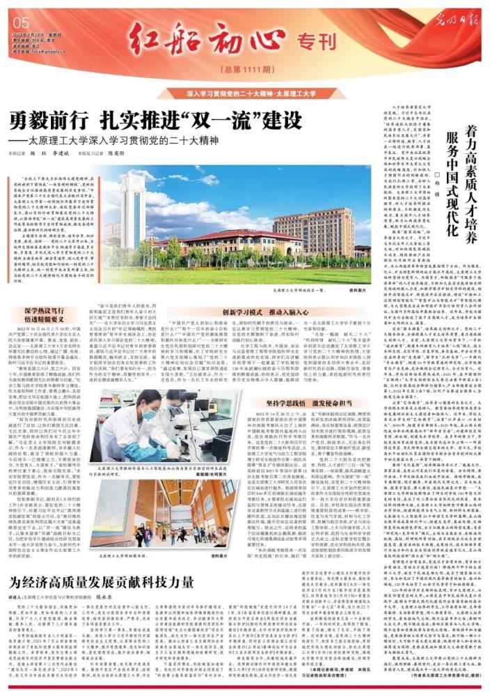 2月23日,《光明日報》“紅船初心”??嫱瞥鎏砉ご髮W深入學習貫徹黨的二十大精神的相關(guān)報道,以《著力高素質(zhì)人才培養(yǎng) 服務中國式現(xiàn)代化》《勇毅前行 扎實推進“雙一流”建設——太原理工大學深入學習貫徹黨的二十大精神》《為經(jīng)濟高質(zhì)量發(fā)展貢獻科技力量》三篇文章,展現(xiàn)太原理工大學以實際行動貫徹落實黨的二十大精神,在推動“雙一流”建設高質(zhì)量發(fā)展中奮進新征程、建功新時代的磅礴力量。