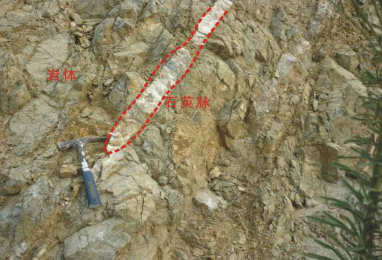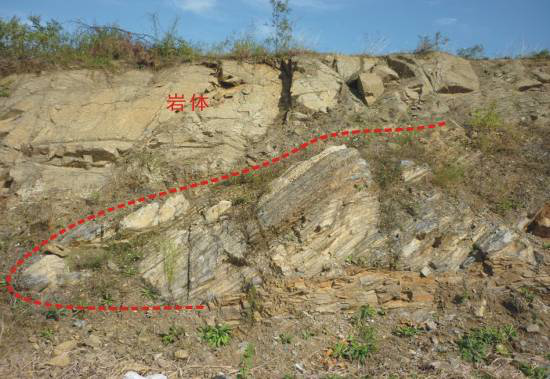 巖體呈北西—南東向侵入于隨縣群柳林組中,其走向和圍巖片理的趨向基本一致。巖體被動變與圍巖的接觸面產(chǎn)狀和圍巖產(chǎn)狀基本一致,都向南西傾,北東邊內(nèi)傾,南西邊外傾,說明巖體為向南西傾斜的巖墻。