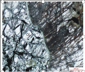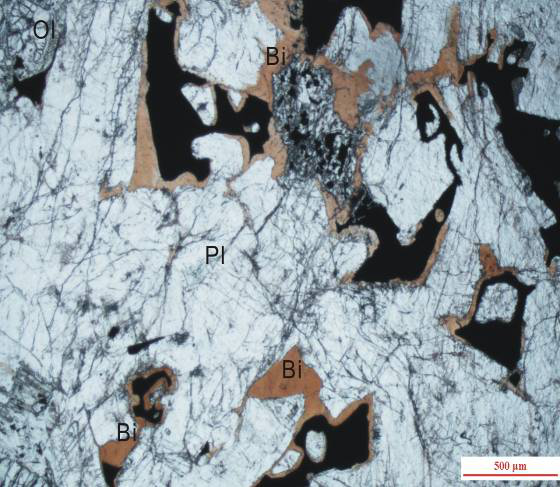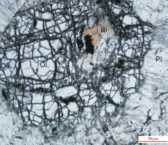 黑云母圍繞橄欖石與不透明礦物生長 |