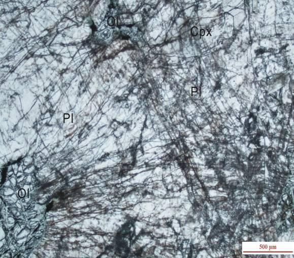 我們在駱店巖體采樣9塊,駱店巖體露頭良好,亦為北西—南東排列,與區(qū)域侵入巖一致,從手標(biāo)本看,巖體色率很深,較之陳巷巖體更顯超基性,駱店巖體整體為橄欖輝長巖,結(jié)構(gòu)更接近輝綠結(jié)構(gòu),斜長石與輝石顆粒大小相差不多,自形晶斜長石之間形成三角形空隙,充填單個的他形輝石顆粒,巖石中暗色礦物主要為橄欖石、單斜輝石。黑云母及一些蝕變礦物,淺色礦物為斜長石。與陳巷巖體相比,反應(yīng)邊結(jié)構(gòu)發(fā)育,且若干薄片中長石裂紋發(fā)育明顯,可見一組極完全解理,礦物生成順序與陳巷巖體相同,即尖晶石—橄欖石—輝石。
