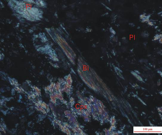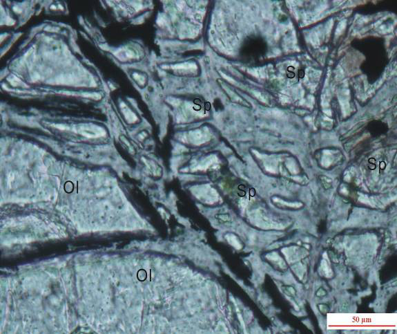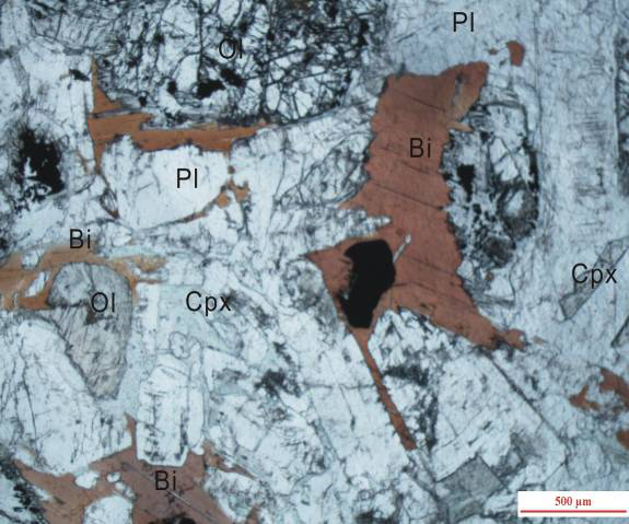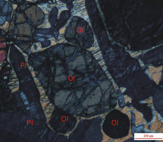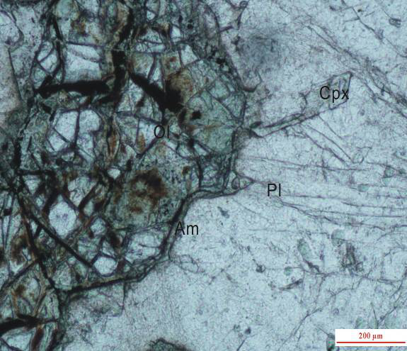 根據(jù)分析,礦物的結(jié)晶順序應(yīng)為尖晶石—橄欖石—輝石—斜長石,即尖晶石為巖漿結(jié)晶的初晶相,其次為橄欖石,再次為輝石,最后是斜長石;圓形橄欖石應(yīng)經(jīng)歷了后期轉(zhuǎn)熔反應(yīng);而黑云母為后期交代作用形成。