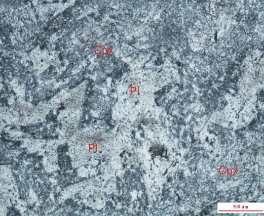 巖石中礦物粒徑從外部相到內(nèi)部相逐漸增大,外部相粒度一般0.5-2毫米,內(nèi)部相粒度1-3毫米,從外部相到內(nèi)部相巖石化學(xué)成分沒有顯著的變化。
