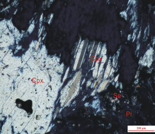 從以上獨崇山薄片分析,該巖石原巖為輝長巖,輝長結(jié)構(gòu),塊狀構(gòu)造,礦物為單斜輝石、斜長石、絹云母、白云母、金紅石及磁鐵礦,輝石及長石皆為他形,輝石常見聚片雙晶,斜長石部分蝕變?yōu)榻佋颇?,而自形程度良好、弱蝕變的斜長石則鑲嵌在各種礦物中;黑云母 內(nèi)部多發(fā)生蝕變,為磁鐵礦和金紅石取代。