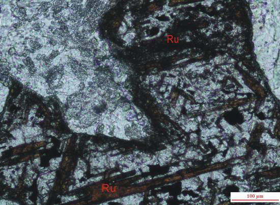 獨崇山巖體采樣于隨州市附近西南部的獨崇山,該巖體圍巖為隨縣群,兩者為不整合接觸關(guān)系,該巖體與地層分界明顯,利于采樣,采樣點可見球形風(fēng)化,且夾雜脈巖,南部邊緣不可尋。該巖體絹云母化的為輝長巖,獨崇山巖體薄片鏡下觀察與陳巷巖體與駱店巖體差別較大,單偏光鏡下顯示灰白—銹黃色,可能含鐵質(zhì)較多,而且蝕變強烈,尤其是長石的蝕變,突起顯得較高,橄欖石不見,輝石蝕變也較嚴重,多呈片狀,其中部分還充填著長石顆粒,薄片中各礦物自形程度均不好,長石較之駱店巖體尤其差,長石在蝕變礦物中還能隱約看見其雙晶從而辨別,輝石在正交鏡下往往最高干涉色為一級黃,巖體中礦物自形程度均較差,而該巖體中含有金紅石,將會在后邊予以討論。