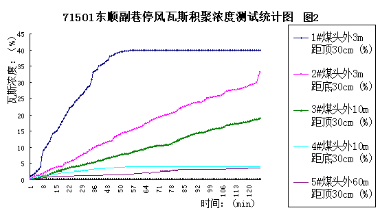 第一組試驗(yàn):在二礦71501東順副巷炮掘工作面進(jìn)行了停風(fēng)瓦斯?jié)舛扔^測試驗(yàn):盲巷長度70m,3:45引爆裝有40塊藥的8個拉槽炮,4:00將事先備好的5枚40%的瓦斯傳感器設(shè)置到預(yù)定位置,隨即停止送風(fēng)126分鐘觀測瓦斯?jié)舛茸兓?/span>