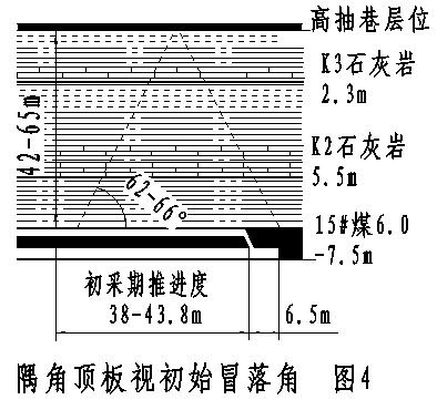 為找到綜放面初采期頂板的冒落規(guī)律,把初采瓦斯抽采巷布置在頂板初始冒落的邊緣帶上,對5個沒有布置初采瓦斯抽采巷的綜放面高抽巷開始抽排瓦斯時的推進(jìn)度值(即初采期推進(jìn)度)和瓦斯情況進(jìn)行了觀測統(tǒng)計(jì),見附表2。從5個綜放面的統(tǒng)計(jì)數(shù)據(jù)得出上隅角頂板的視初始冒落角度為62o~66o,見圖4示。據(jù)此,在80613綜放面用一條小斷面、大仰角的初采瓦斯處理巷,將上隅角與走向高抽巷溝通,詳見圖1。
