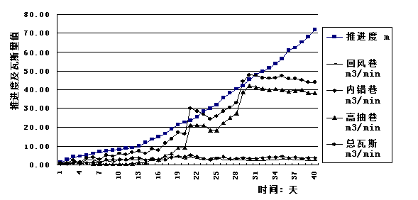 當(dāng)工作面推進(jìn)到40.25m后,總瓦斯量進(jìn)一步增加,平均值為55.20 m3/min,最大值78.01m3/min,但冒裂帶與高抽巷連通,內(nèi)錯巷瓦斯由最大38.25 m3/min降為平均為6.27m3/min(最小2.48 m3/min),而高抽巷瓦斯排量由1.46 m3/min上升到47.72 m3/min(最高達(dá)73.66 m3/min),占總瓦斯量的86.45%(最高達(dá)94.66%)。標(biāo)志著初采期結(jié)束,工作面平均日推進(jìn)度由1.55m提高到3.46m。