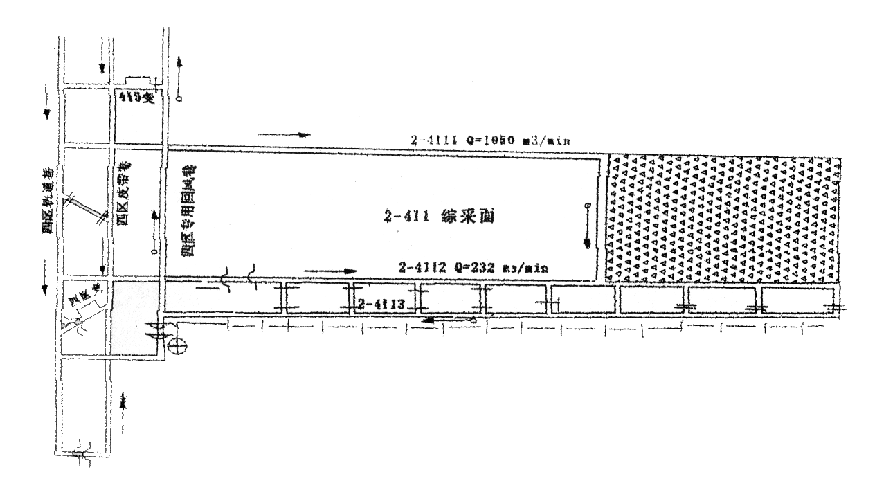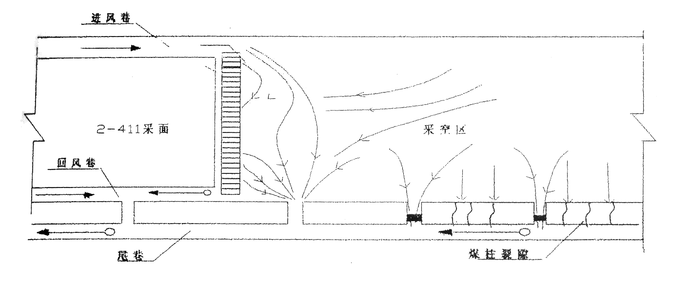 2-411工作面于2003年10月開始回采,工作面瓦斯涌出量約10-15m3/min,其中工作面采空區(qū)瓦斯涌出量較大,占工作面總瓦斯涌出量的60%以上。隨著生產(chǎn)的進行,采空區(qū)面積的加大,采空區(qū)瓦斯涌出量有加大的趨勢,采用兩進一回通風(fēng)系統(tǒng)雖然緩解了上隅角瓦斯超限問題,但尾巷、液壓支架間仍有瓦斯積聚現(xiàn)象發(fā)生,個別區(qū)域瓦斯?jié)舛壬踔吝_(dá)到10%,工作面被迫停產(chǎn)近一個月。