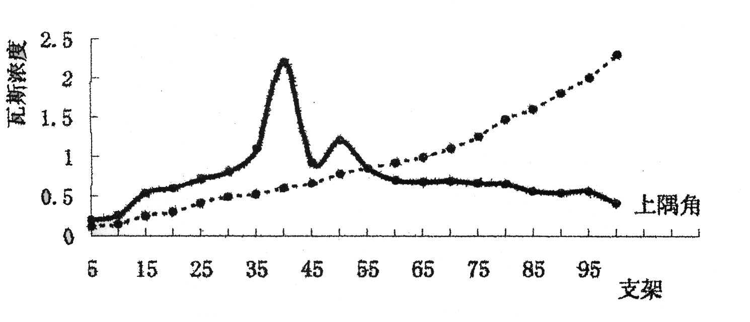 采空區(qū)內(nèi)瓦斯涌出的能量來自于濃度差及采空區(qū)漏風(fēng)。由于采空區(qū)深部的瓦斯?jié)舛雀哂诓擅嫱咚節(jié)舛?,而氣體總是從濃度高的地方向濃度低的地方擴散、流動,直至趨向平衡,采空區(qū)瓦斯涌出的另一個重要原因是在采空區(qū)靠近采面的空間內(nèi)存在著漏風(fēng),在采空區(qū)形成通風(fēng)負(fù)壓,漏風(fēng)風(fēng)流攜帶濃度較高的瓦斯向工作面涌出,由于液壓支架的存在,造成支架的后上方局部瓦斯積聚,給工作面生產(chǎn)造成安全隱患。此外,2-411工作面尾巷要保留,下一個工作面繼續(xù)使用,為使尾巷不成為盲巷,利用局扇向尾巷最里面供風(fēng),稀釋巷內(nèi)的瓦斯,但隨著采空區(qū)面積的加大,采空區(qū)深部高濃度瓦斯涌出到尾巷,尾巷內(nèi)瓦斯?jié)舛葧r有超限現(xiàn)象。