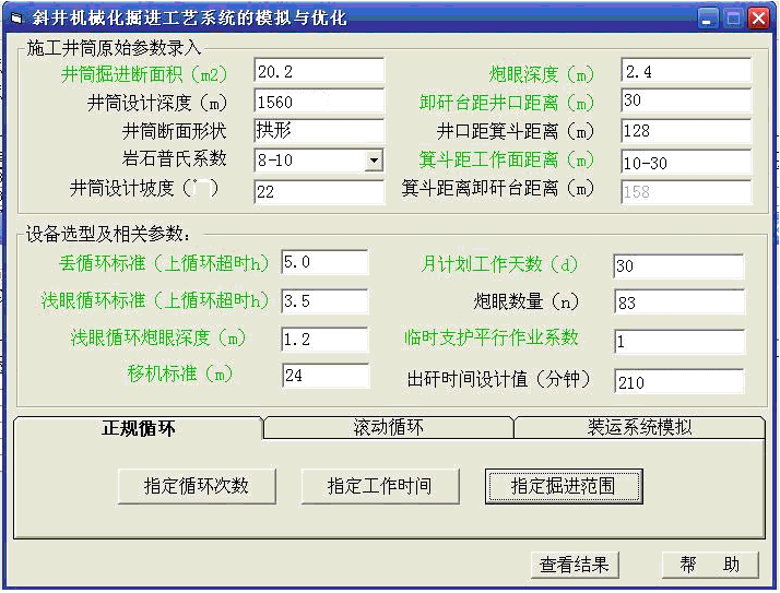 通過(guò)對(duì)施工幾大系統(tǒng)中諸實(shí)體的屬性及它們之間的邏輯關(guān)系進(jìn)行分析研究,建立斜井施工模擬系統(tǒng)的計(jì)算機(jī)模擬模型,模型由一個(gè)主程序幾個(gè)子程序和輸出打印程序組成,采用VB程序進(jìn)行編寫(xiě),界面如圖。