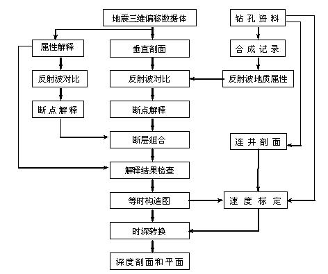 我公司在山西寧武某地完成了三維地震勘探工作,對(duì)2號(hào)煤層、5號(hào)煤層進(jìn)行了構(gòu)造解釋。解釋步驟如下:①搜集了有關(guān)已知地質(zhì)資料,分析區(qū)內(nèi)地質(zhì)構(gòu)造規(guī)律,將宏觀的區(qū)域地質(zhì)構(gòu)造規(guī)律和勘探區(qū)地質(zhì)構(gòu)造規(guī)律相結(jié)合,對(duì)勘探區(qū)內(nèi)鉆孔資料進(jìn)行深入細(xì)致的研究,了解勘探區(qū)內(nèi)的地層賦存形態(tài)、構(gòu)造發(fā)育特征。②利用已知鉆孔資料及地質(zhì)成果,綜合分析,對(duì)比聯(lián)井時(shí)間剖面,進(jìn)行地質(zhì)層位的標(biāo)定。③提取多個(gè)屬性參數(shù),在最短時(shí)間內(nèi)得到構(gòu)造的空間展布、組合等地質(zhì)信息。④按照從整體到局部、先稀疏后加密、由簡單到復(fù)雜的解釋原則。解釋過程中,縱向、橫向和任意向時(shí)間剖面相結(jié)合,并參照水平切片、順層切片及各種屬性分析,先進(jìn)行80m×80m網(wǎng)格的解釋,形成了地質(zhì)構(gòu)造的大輪廓,逐步加密到20m×20m的網(wǎng)格,確定出全區(qū)的基本構(gòu)造方案。再利用解釋軟件自動(dòng)追蹤功能對(duì)層位和構(gòu)造加密到5m×5m的解釋網(wǎng)格密度,全方位的反復(fù)對(duì)比、反復(fù)檢查、反復(fù)修改,確保解釋小褶曲及小斷層正確可靠,最終形成精細(xì)的解釋方案。解釋流程見圖3。