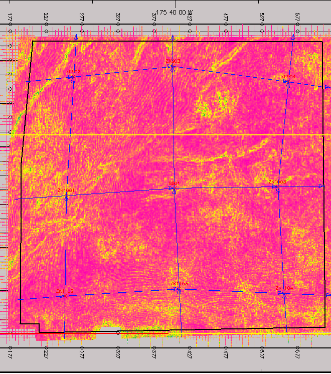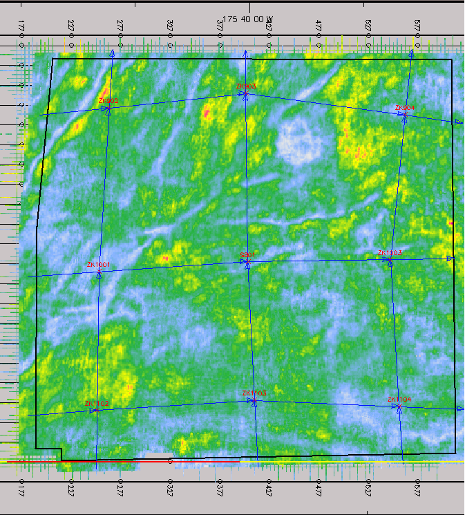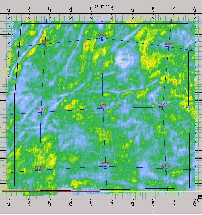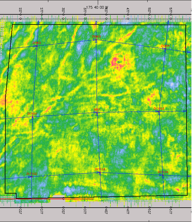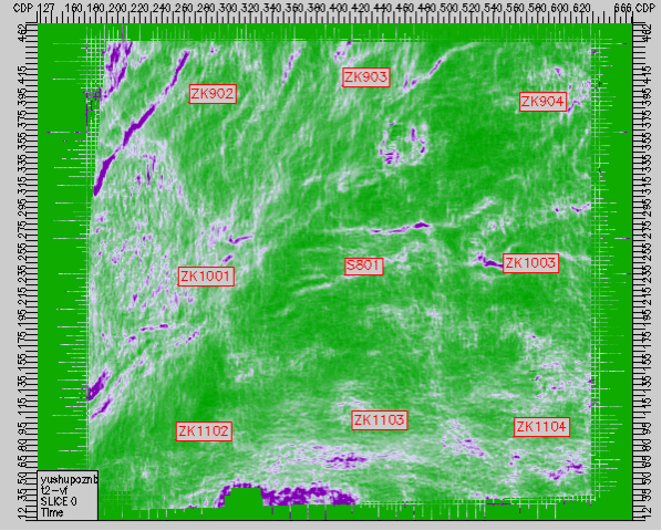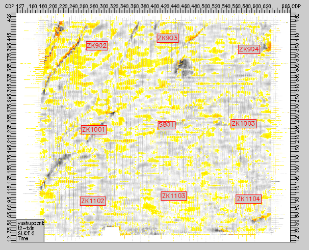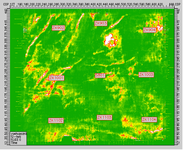 從屬性切片中均可發(fā)現(xiàn),屬性切片可以直觀地了解斷層等構(gòu)造及巖性的空間展布和組合關(guān)系,因此,構(gòu)造解釋可以從切片解釋開始,這就避免了單條剖面解釋時(shí),在構(gòu)造復(fù)雜地區(qū)斷層展布及組合關(guān)系不清楚的情況下解釋的隨意性,這種解釋方法受人為因素影響較小,尋找的斷層較客觀,減少了多解性,且對(duì)斷層與巖性邊界,反映得更加清晰。由于對(duì)構(gòu)造情況有整體認(rèn)識(shí),在沒有構(gòu)造的地區(qū)可以采用自動(dòng)追蹤層位,且能夠隨時(shí)監(jiān)控解釋結(jié)果的正確性,及時(shí)糾正解釋過程中可能出現(xiàn)的錯(cuò)誤,還能幫助分析地層巖性的變化情況。