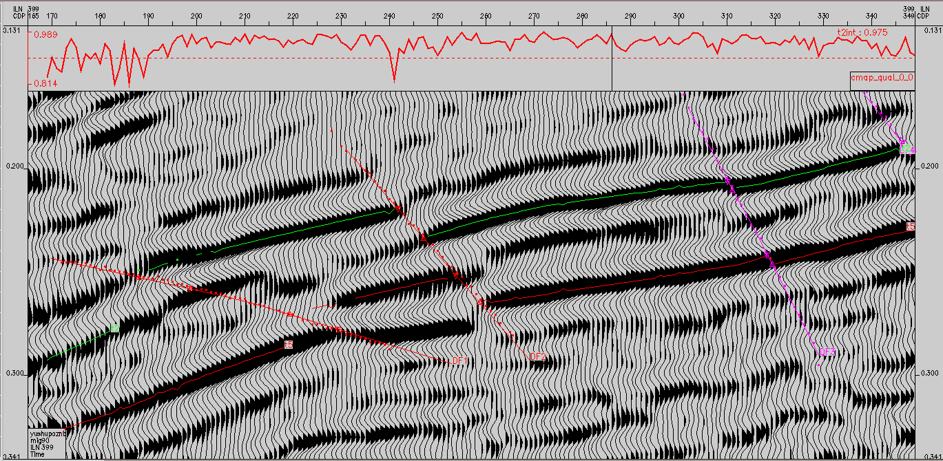 本次對(duì)一些小斷層也進(jìn)行了解釋,如圖5 DF3斷層在時(shí)間剖面上反應(yīng)不是很明顯,用常規(guī)的人工識(shí)別方法往往容易漏解釋。但是,在地震屬性上反映明顯,利用地震屬性差異,可以解決小斷層異常解釋的問題。