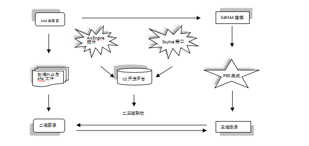 本系統(tǒng)的設(shè)計思路是將在arcgis中存儲并展示的二維數(shù)據(jù)與在TerraExplorer Pro中加載的三維數(shù)據(jù),依靠C#語言,以Microsoft Visual Studio為程序開發(fā)平臺,集成ArcEngine和Skyline TerraExplorer API分別提供的接口和ActiveX控件統(tǒng)一到一個系統(tǒng)中,并且通過編程使得“將屏幕坐標與地理坐標相互聯(lián)接”的思想得以實現(xiàn),最終得到二三維聯(lián)動的效果。設(shè)計思路如圖1: