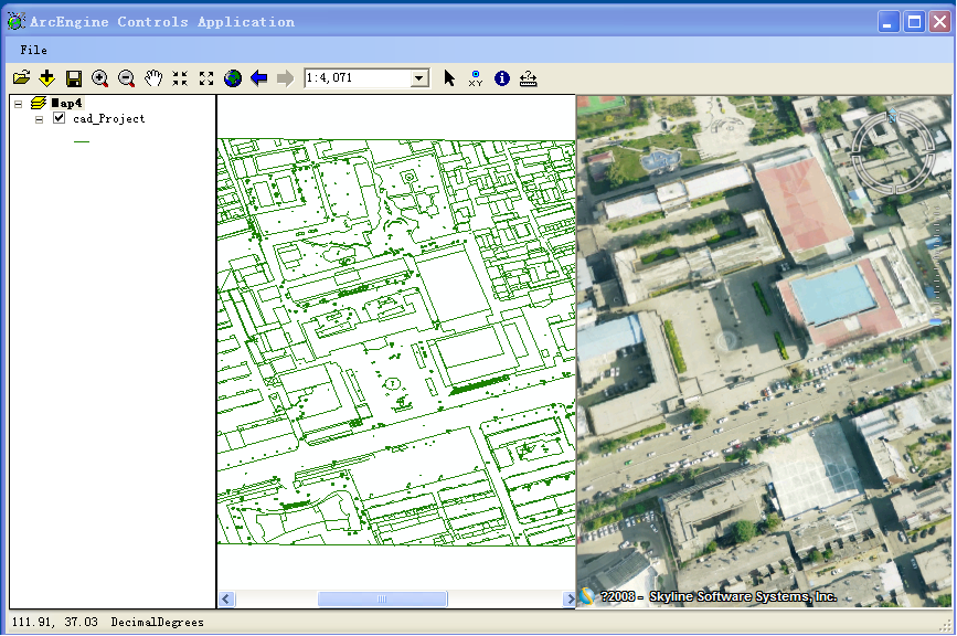 ArcGIS Engine提供了ToMapPoint方法可以獲得當前鼠標所在位置的地理坐標,通過TerraExplorer Pro的TerraExplorerX.IPlane5接口的MovePosition方法可以將三維窗口的中心點移到該地理坐標,即可實現(xiàn)二維控制三維。同樣TerraExplorer Pro同樣提供了TerraExplorerX.IPlane5接口的ScreenToWorld方法獲得當前鼠標所在位置的地理坐標,而ArcGIS Engine提供的CenterAt的方法,不能對二維窗口比例尺縮放,必須重繪二維窗口的Extent,三維控制二維也完成了,整個系統(tǒng)的核心部分也就實現(xiàn)了。程序運行的主界面如圖2所示: