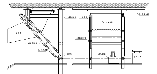 2、將兩根油缸通過抱板、連接耳及給煤機外側上的工字鋼、槽鋼門型固定架,固定于給煤機兩側的指定位置,用特制穿銷和特制油缸開槽連接耳,連接給煤機插板與油缸;