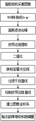 2、通過圖像處理方法對(duì)皮帶是否跑偏進(jìn)行故障診斷。皮帶跑偏智能檢測(cè)系統(tǒng)采用圖像處理中霍夫變換算法。通過確定安裝相機(jī)位置建立坐標(biāo)系,由霍夫變換的算法檢測(cè)皮帶兩邊緣直線,由相機(jī)采集的圖像信息進(jìn)行分析,建立系統(tǒng)模型并確定皮帶正常運(yùn)行閾值,當(dāng)皮帶運(yùn)行時(shí)偏離所確定的閾值,根據(jù)所確定閾值再進(jìn)行實(shí)驗(yàn)分析,對(duì)皮帶跑偏故障進(jìn)行分級(jí),系統(tǒng)將故障信息和等級(jí)顯示在上位機(jī)界面。其技術(shù)路線圖如下: