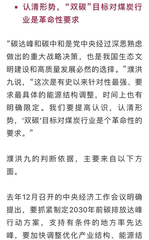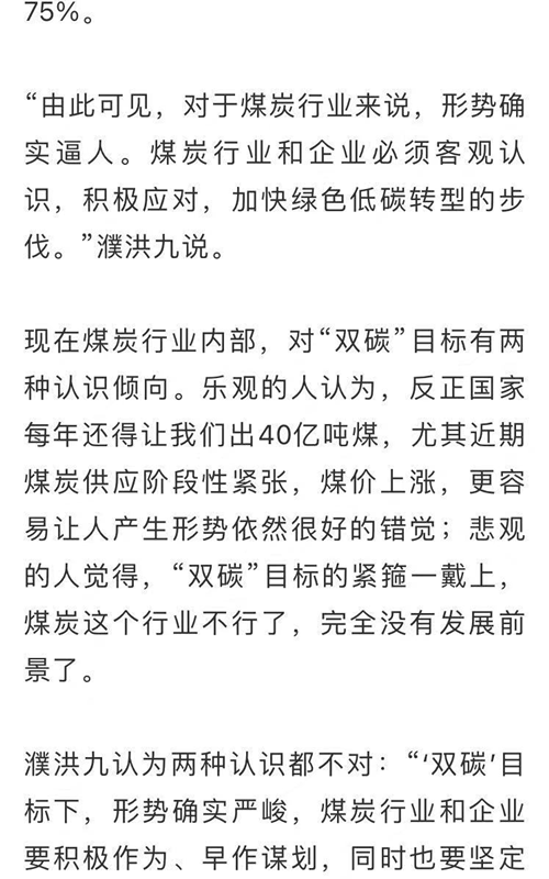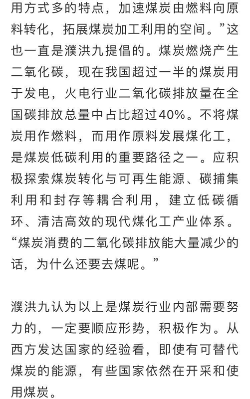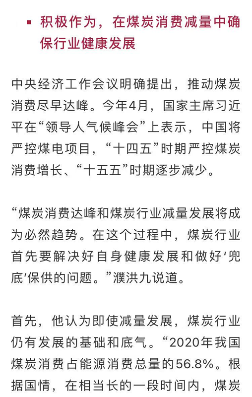 七八年前全國霧霾較為嚴(yán)重時(shí),社會(huì)上對煤炭和煤電非議很大。煤炭和電力行業(yè)很快研究出了燃煤電廠超低排放技術(shù),燃煤電廠的污染物排放達(dá)到燃?xì)怆姀S水平。截至2020年底,全國燃煤電廠完成超低排放和節(jié)能改造9.5億千瓦,占全國燃煤電廠總裝機(jī)的76%左右?,F(xiàn)在空氣質(zhì)量好轉(zhuǎn),也很少有因此對煤炭和煤電的非議了。以前煤礦經(jīng)常發(fā)生安全事故,而且煤礦井下工人越來越難招,近幾年,煤炭行業(yè)快速推廣智能化礦山建設(shè)。截至2020年底,全國已建成400多個(gè)智能化采掘工作面,采煤、鉆錨、巡檢等19種煤礦機(jī)器人在井下實(shí)施應(yīng)用,71處煤礦列入國家首批智能化示范建設(shè)煤礦。井下工作面用人大幅減少,煤礦職工作業(yè)環(huán)境安全系數(shù)提高了,勞動(dòng)強(qiáng)度降低了??梢灶A(yù)見,將來的煤礦將更安全高效智能,煤炭行業(yè)從勞動(dòng)密集型行業(yè)正在向技術(shù)密集型行業(yè)轉(zhuǎn)變。“這些科技上的突破,給煤炭行業(yè)帶來了生機(jī),也給了煤炭人應(yīng)對新挑戰(zhàn)的信心?!?濮洪九說,“認(rèn)清形勢,是為了積極認(rèn)真應(yīng)對,同時(shí)也應(yīng)有堅(jiān)定的信心,前路都是靠自己一點(diǎn)點(diǎn)探出來的?!?span style="font-family:宋體;font-size:10.5pt;"> “雙碳”目標(biāo)一公布,有些煤炭企業(yè)就開始研究制定應(yīng)對方案了。例如,國家能源集團(tuán)去年12月就組織召開“碳中和愿景下我國能源轉(zhuǎn)型戰(zhàn)略研討會(huì)”,啟動(dòng)研究率先引領(lǐng)能源煤炭電力行業(yè)碳達(dá)峰、碳中和的戰(zhàn)略路徑?,F(xiàn)在他們已提出到2025年提前實(shí)現(xiàn)碳達(dá)峰。再例如,晉能控股集團(tuán)與中國煤炭科工集團(tuán)簽署“碳達(dá)峰、碳中和”戰(zhàn)略研究合作協(xié)議,并第一時(shí)間成立了“碳達(dá)峰、碳中和”戰(zhàn)略研究工作組,積極探索能源低碳減量可行先進(jìn)技術(shù),穩(wěn)步推進(jìn)全產(chǎn)業(yè)鏈效率提升、節(jié)能減排。還有其他一些大企業(yè),也紛紛研究應(yīng)對策略。濮洪九希望全行業(yè)能對此更重視,有更多的企業(yè)積極行動(dòng)起來。“人無遠(yuǎn)慮,必有近憂。對于煤炭行業(yè)和企業(yè),‘雙碳’目標(biāo)的約束已是近憂了,必須主動(dòng)考慮,盡快根據(jù)形勢、政策和企業(yè)自身的實(shí)際情況,做出頂層設(shè)計(jì),規(guī)劃轉(zhuǎn)型線路圖?!?span style="font-family:宋體;font-size:10.5pt;">