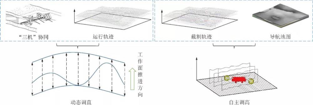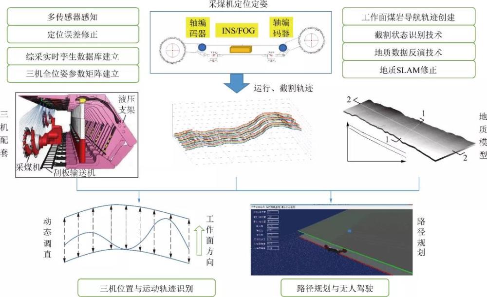 并提出了適用于深部煤層采煤機自動駕駛的導(dǎo)航截割理論與技術(shù)框架,包括導(dǎo)航地圖、位姿感知、路徑規(guī)劃、姿態(tài)控制4項技術(shù)內(nèi)涵和精細(xì)化煤層截割定位地圖、精準(zhǔn)化煤層截割導(dǎo)航地圖、動態(tài)化煤層截割導(dǎo)控地圖、采煤機融合定位方法、定位精度提升、智采機組全位姿參數(shù)矩陣建立、物理-虛擬模型驅(qū)動與交互、無人駕駛防沖撞路徑規(guī)劃、截割作業(yè)智能調(diào)高調(diào)直9項關(guān)鍵技術(shù)。