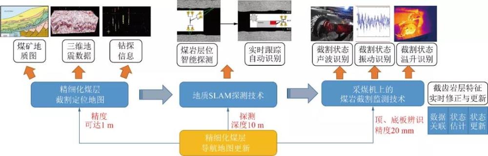 系統(tǒng)闡述了采煤機自主導(dǎo)航截割相關(guān)核心技術(shù)基本原理:首先,構(gòu)建煤層智能化開采導(dǎo)航地圖,從精細(xì)化煤層截割定位、精準(zhǔn)化煤層截割導(dǎo)航和動態(tài)化煤層截割導(dǎo)控3個關(guān)鍵步驟實現(xiàn)地圖構(gòu)建及更新。