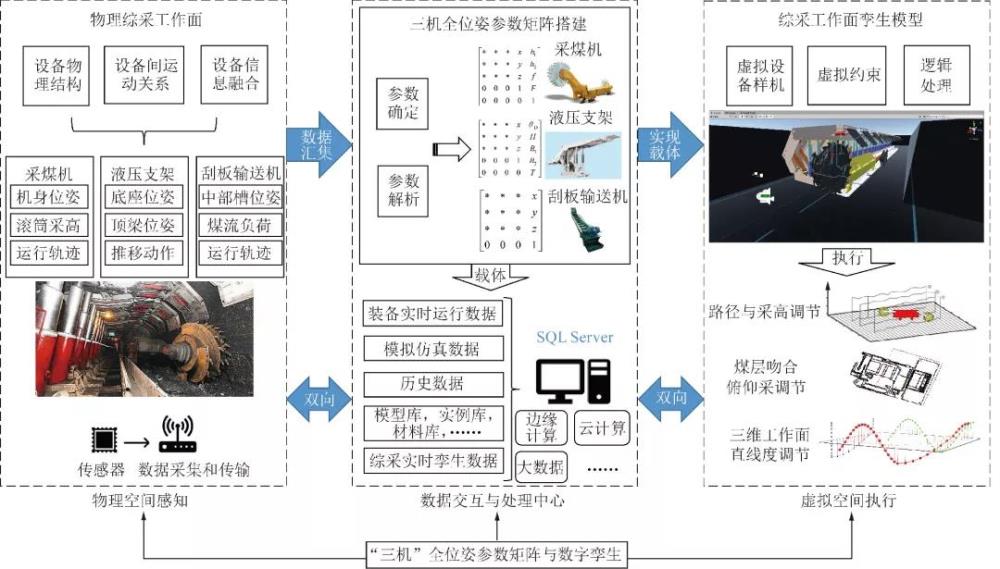 其次,通過融合定位和定位精度提升方法,完成了采煤機位姿精確感知;再次,創(chuàng)建智采機組全位姿參數(shù)矩陣,并結(jié)合物理-虛擬模型驅(qū)動與交互技術(shù)構(gòu)建出導(dǎo)航截割數(shù)字孿生系統(tǒng)。