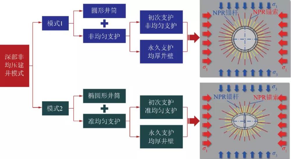 隨著淺部煤炭資源的日益枯竭,我國(guó)煤炭開采朝著深部化和大型化方向發(fā)展,新建和改擴(kuò)建的大型立井年生產(chǎn)能力已達(dá)1000萬t,開采最大深度已達(dá)1500 m。千米深井在建井時(shí)所處的高應(yīng)力、“各向異性”(包括巖體、結(jié)構(gòu)、應(yīng)力等) 復(fù)雜地質(zhì)力學(xué)環(huán)境,造成井筒以及井底車場(chǎng)大巷圍巖出現(xiàn)塌方、巖爆以及沖擊地壓等大變形災(zāi)害,嚴(yán)重影響深部礦井安全高效建設(shè)。在國(guó)家重點(diǎn)研發(fā)計(jì)劃“深地資源勘查開采”重點(diǎn)專項(xiàng)“煤礦深井建設(shè)與提升基礎(chǔ)理論及關(guān)鍵技術(shù)”支持下,提出了深部非均壓建井模式,以非均勻支護(hù)應(yīng)對(duì)非均勻圍巖壓力;對(duì)煤系地層深部建井中典型的地層結(jié)構(gòu)進(jìn)行分類,并建立了深部不同應(yīng)力條件下立井井筒力學(xué)模型。開展了一系列模擬深部環(huán)境下的多場(chǎng)、多尺度巖石力學(xué)實(shí)驗(yàn),探明了深部建井巖體的各向異性與深部環(huán)境相互作用過程中的大變形力學(xué)特性,揭示了深部復(fù)雜地質(zhì)環(huán)境下巖體大變形力學(xué)機(jī)理。