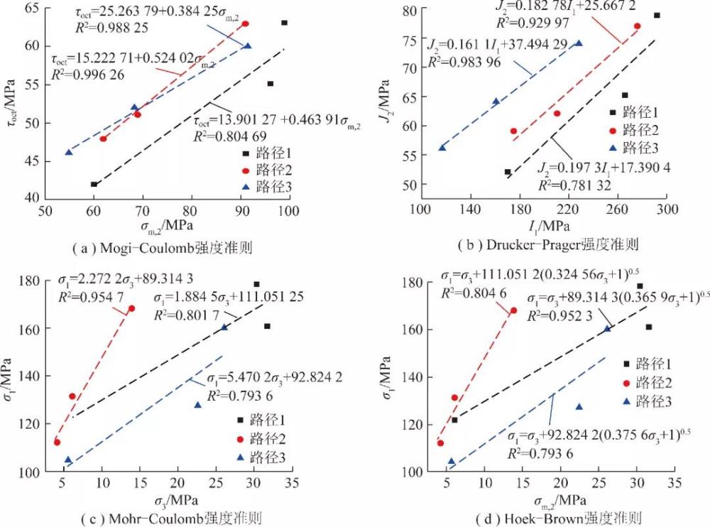 不同模擬深度、相同應(yīng)力路徑下深部砂巖強(qiáng)度準(zhǔn)則擬合曲線