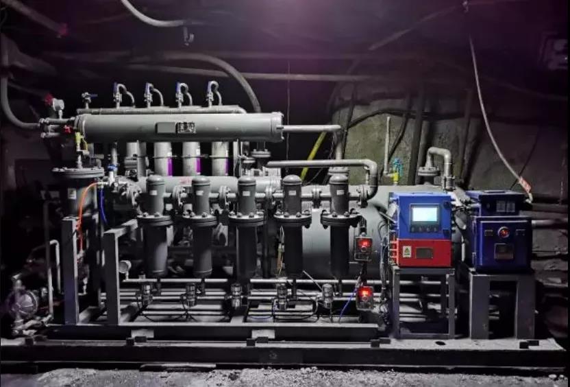 沈陽研究院針對以上松軟煤層長距離鉆孔施工難題,歷時兩年多時間,成功研制出國內首套煤礦用超高壓膜分離制氮裝備,出口壓力1.5~2.0MPa可調,產氣量可達900m3/h,制氮效率高,壓力損失小,適合長距離輸送。與傳統(tǒng)的制氮裝置相比,具有氮氣輸出壓力高的技術優(yōu)勢;與原有的供水、供風輔助鉆進排渣工藝相比,采用惰性氣體防火效果更好,施工過程更安全可靠。適用于煤礦井下松軟煤層定向鉆進中輔助氮氣排渣,鉆孔施工防自燃發(fā)火,有效保障松軟煤層鉆孔施工安全。