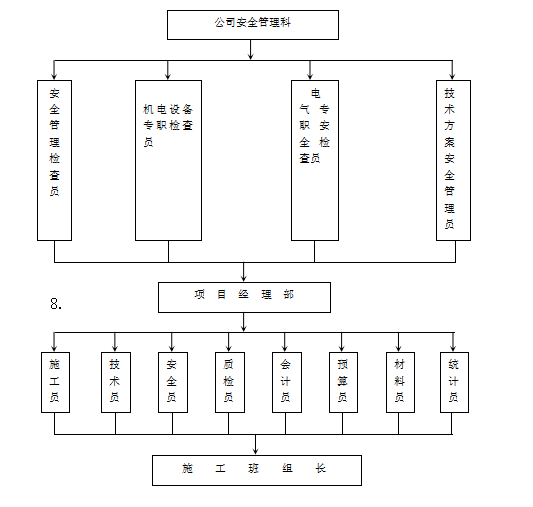 (3)項(xiàng)目部工程師:主持制定工程項(xiàng)目的安全技術(shù)措施和各分項(xiàng)工程的安全方案,督促安全措施落實(shí),解決施工過(guò)程中的不安全的技術(shù)問(wèn)題。