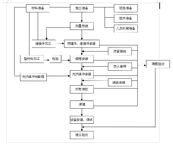 方案設(shè)計(jì)→部件加工、購置→預(yù)埋件安裝→光電施工準(zhǔn)備→測(cè)量放線→光電器材安裝→玻璃光伏幕墻施工→線纜安裝→設(shè)備就位→系統(tǒng)運(yùn)行(工藝流程圖,見下圖)
