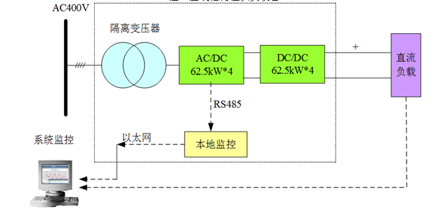 PWS2-250K/500K由4個(gè)62.5KW AC/DC,4個(gè)DCDC模塊單元、控制單元、監(jiān)控單元等組成。