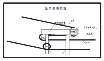 巷道上山掘進(jìn)時(shí)在變坡點(diǎn)位置利用壓輥將上皮帶通過變坡壓帶裝置來解決該處皮帶上飄,煤矸灑落、運(yùn)輸不暢、難以維護(hù)等問題。