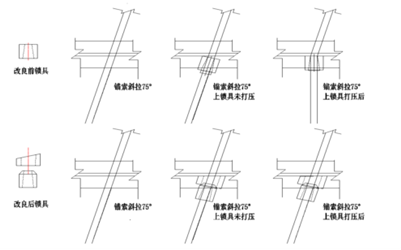 掘進(jìn)巷道過(guò)程中經(jīng)常會(huì)遇到頂板層間距薄或者巷道壓力大,需要在特殊地段采取斜拉錨索吊掛鋼梁或者單點(diǎn)斜拉錨索加強(qiáng)支護(hù);在實(shí)際操作過(guò)程中經(jīng)常會(huì)出現(xiàn)錨索從鎖具根部拉斷現(xiàn)象,這是由于使用斜拉錨索在使用普通鎖具壓緊時(shí),錨索在鎖具根部產(chǎn)生變形,錨索收到了橫向剪切力,在受力時(shí)剪切力逐漸增大導(dǎo)致錨索在鎖具根部斷裂;在這種情況下,我們?cè)阪i具上進(jìn)行創(chuàng)新,將鎖具進(jìn)行改良。