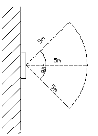 “GUR5”型人體熱釋紅外傳感器采用了熱釋電紅外傳感信號(hào)處理專用集成電路,配以PIR熱釋電傳感器、菲涅爾等元器件,構(gòu)成被動(dòng)式的熱釋電紅外開關(guān)、報(bào)警用熱釋紅外傳感器。傳感器加上光學(xué)透鏡后,其檢測(cè)距離為5m?!癎UR5”型人體熱釋紅外傳感器檢測(cè)范圍示意圖如圖1所示。