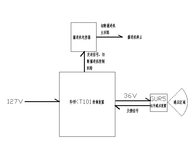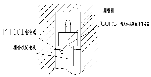 當(dāng)人體誤入紅外感應(yīng)區(qū)域時(shí),“GUR5”型人體熱釋紅外傳感器自動(dòng)探測(cè)人體發(fā)射的7-10um左右的紅外線,將給華宇控制箱中的繼電器一個(gè)電流信號(hào),該信號(hào)的切入能使控制箱中的斷電器工作,斷開控制系統(tǒng)中控制掘進(jìn)機(jī)開停的閉鎖控制回路,從而達(dá)到停止掘進(jìn)機(jī)主回路的目的,掘進(jìn)機(jī)停止運(yùn)轉(zhuǎn),保障了人員的安全。