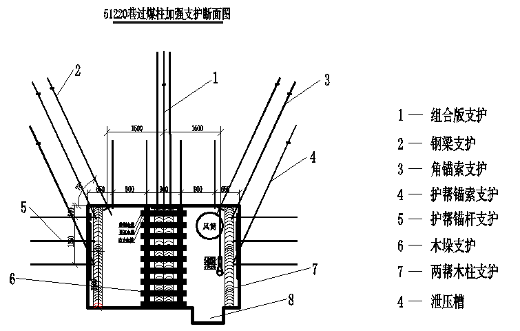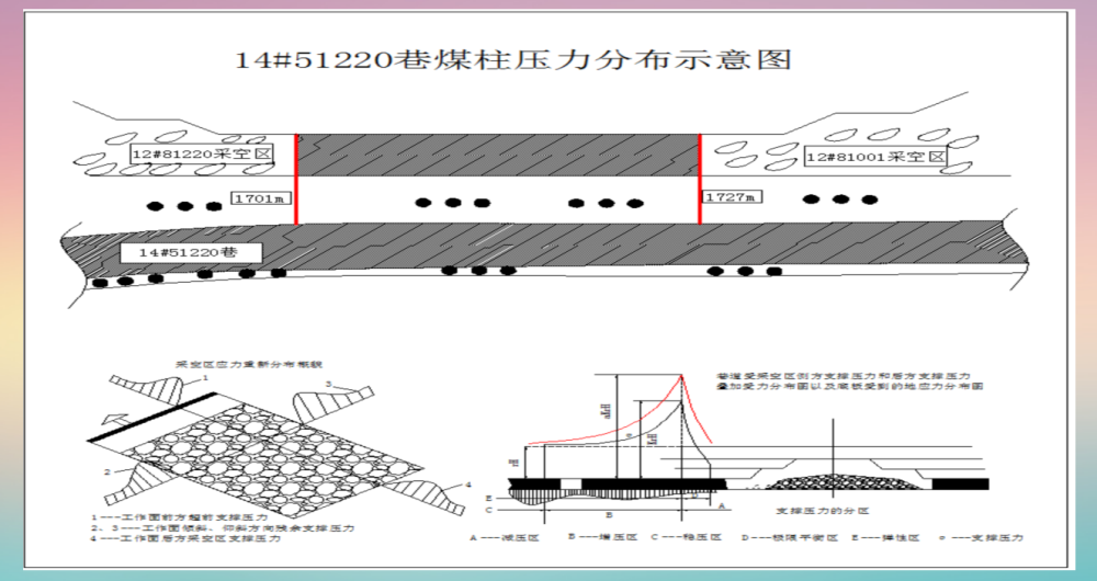 51220巷掘至1701m出上覆12#層81220面采空區(qū),掘至1727m進(jìn)入12#層81001面采空區(qū)。煤柱寬26m。為避免由于煤柱壓力及相鄰14#層81218工作面回采時(shí)動(dòng)壓開(kāi)采影響,造成巷道頂板下沉、炸幫嚴(yán)重等壓力顯現(xiàn),特對(duì)巷道1691m-1737m段采取加強(qiáng)支護(hù)措施。