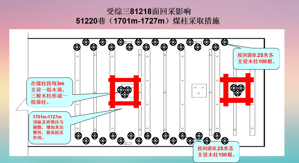 (2)、在1701m-1727m區(qū)段,增加木垛支護(hù),間距3米。