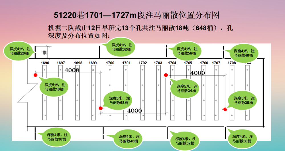 在1701m-1727m共計(jì)26米處注馬麗散。注馬麗散孔深5米封空3米,頂板離幫1米左右交叉布置鉆孔,鉆孔間距3米左右,左右兩幫對(duì)應(yīng)布置鉆孔間距6米左右。