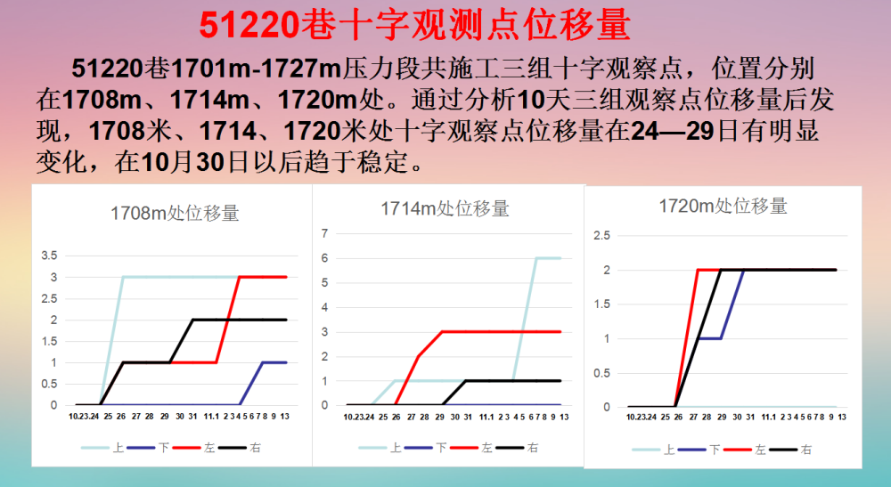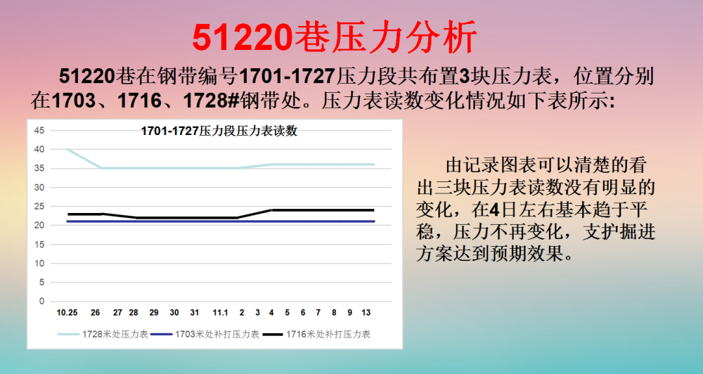 通過(guò)多種支護(hù)方式的聯(lián)合運(yùn)用,以及對(duì)巷道頂、幫及底板采取的有效支護(hù)泄壓手段,尤其是底板泄壓槽的施工,孤島煤柱下掘進(jìn)巷道壓力顯現(xiàn)明顯減弱,達(dá)到預(yù)期效果。以下為施工時(shí)壓力表及巷道“十字觀察法”記錄圖表,從圖表中可以明顯看出巷道頂幫變形不明顯,壓力得到了有效的控制。