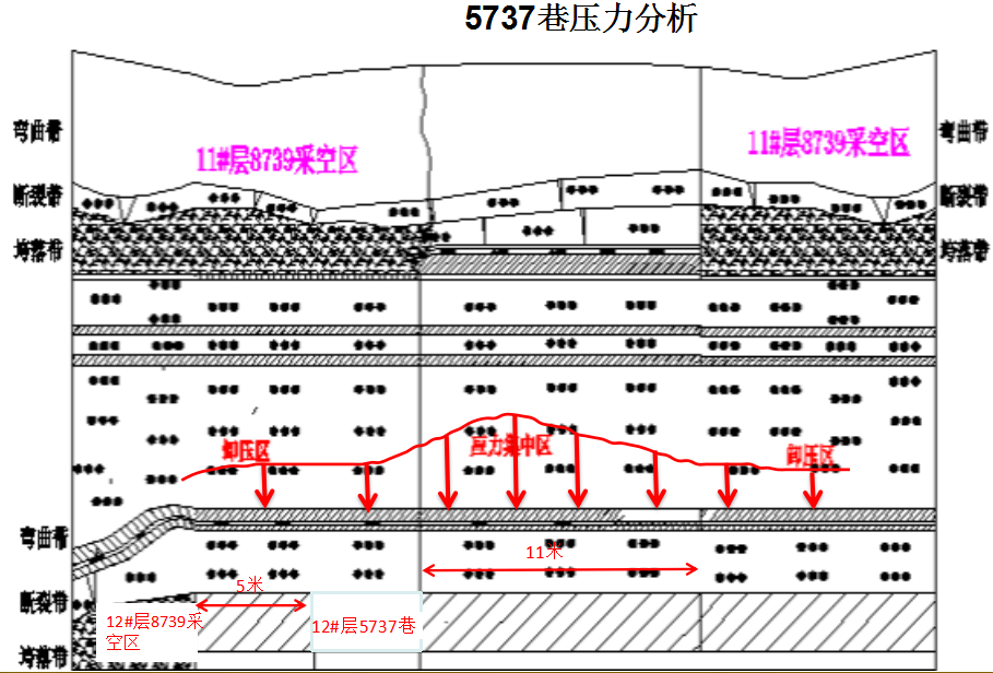 12#層5737巷壓力來(lái)源主要受上覆11#層8739面采空區(qū)和11#層8737面采空區(qū)中間保護(hù)煤柱壓力與同層12#層8739面回采動(dòng)壓多重壓力影響。