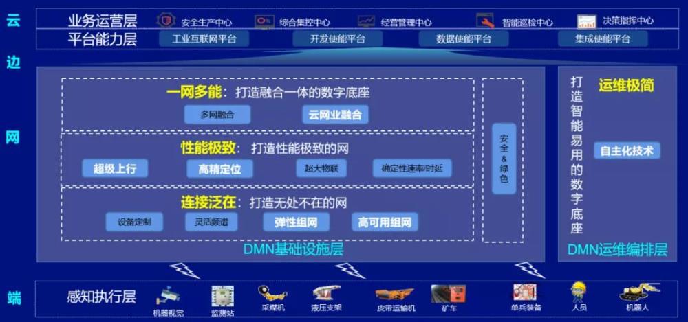 5G DMN構(gòu)想,重定義了地下移動通信網(wǎng)絡(luò),未來將會形成天地通信、地面通信、地下通信三張通信網(wǎng)。當(dāng)前地面通信作為廣域大覆蓋場景,2G、3G、4G和5G移動通信體系已非常成熟并持續(xù)演進,但礦山等地下場景作為相對獨立的狹長封閉空間,在無線電傳播特征、網(wǎng)絡(luò)部署及應(yīng)用的安全性、可靠性、可用性等方面均具有獨特性。為了更好地推動技術(shù)標(biāo)準(zhǔn)和產(chǎn)業(yè)成熟,解決礦山智能化當(dāng)前面臨的挑戰(zhàn)并能夠長期持續(xù)發(fā)展,中國移動和華為聯(lián)合提出了5G DMN創(chuàng)新解決方案構(gòu)想,重定義地下移動通信網(wǎng)絡(luò),服務(wù)于礦山的全面智能化升級。