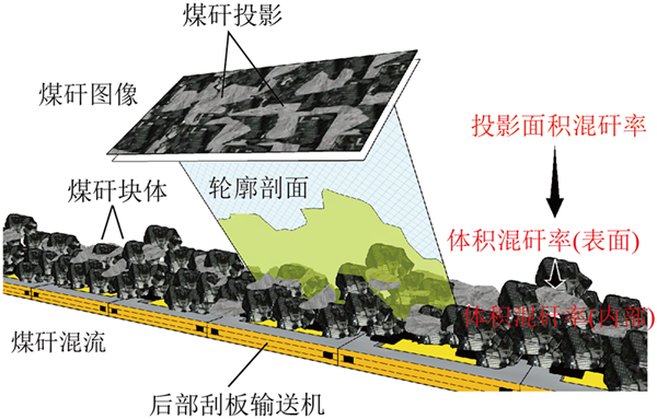 混矸率是一個(gè)廣義的概念,不僅可以用投影面積比表示,還可以用表面積比或者體積比表示。通過統(tǒng)計(jì)二維圖像中像素點(diǎn)個(gè)數(shù),可以得到用投影面積表示的混矸率。實(shí)際上,放頂煤工作面后部刮板運(yùn)輸機(jī)上煤流中的煤和矸石是三維塊體,且相互疊壓堆積,所以,通過煤矸二維圖像反演煤矸塊體三維堆積形態(tài),獲得煤流表面的體積混矸率,并且對(duì)疊壓在煤流內(nèi)部的體積混矸率進(jìn)行預(yù)測(cè),這是一種提升混矸率測(cè)量精度的方法,也是圖像識(shí)別智能放煤技術(shù)有別于且領(lǐng)先于其他監(jiān)測(cè)手段或方法的地方,這將在后面幾節(jié)展開介紹。